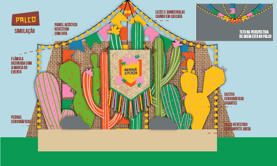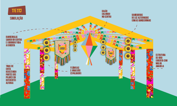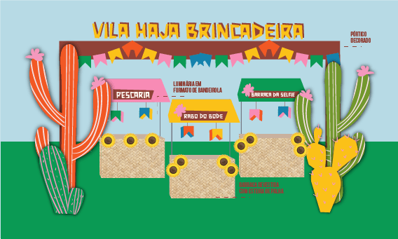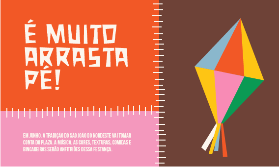 A partir de um convite da Obba Produções, pensamos juntos o conceito e a cenografia do Arraiá do Plaza Shopping, evento em comemoração ao São João. Acompanhei o projeto do início ao fim: desde a defesa do conceito, brainstorm para atrações e decoração até a execução do projeto em si. Foi incrível ver as cores e ilustrações ganhando vida!