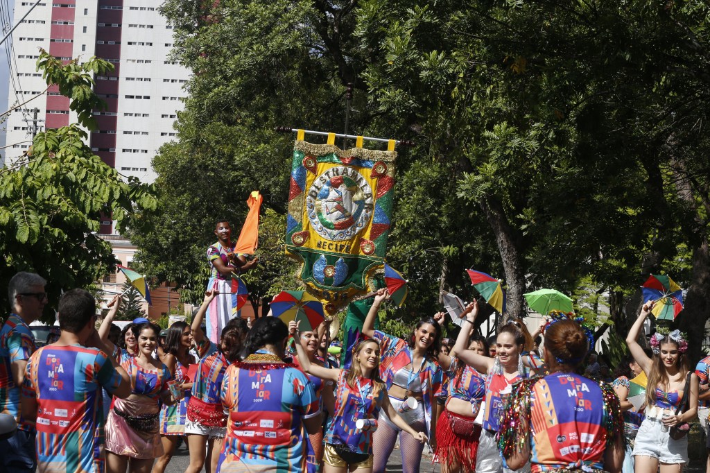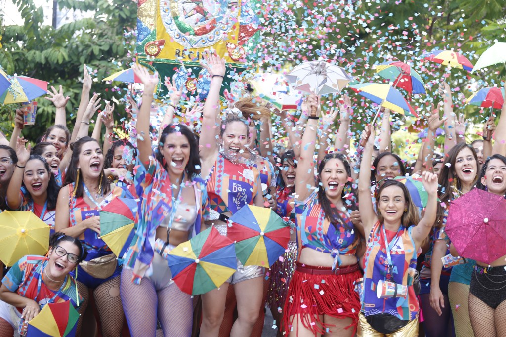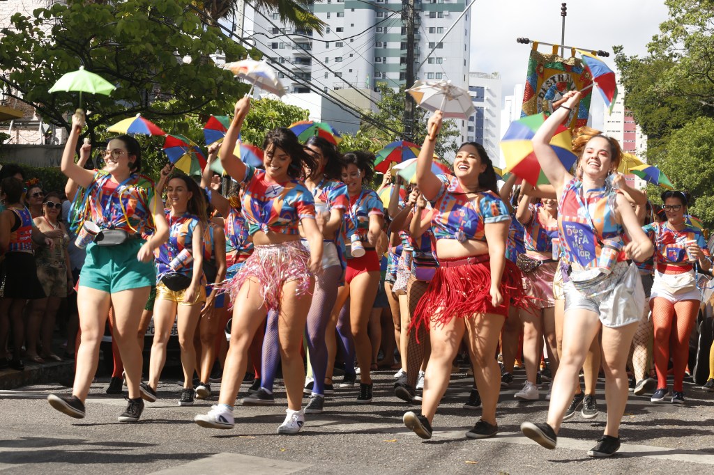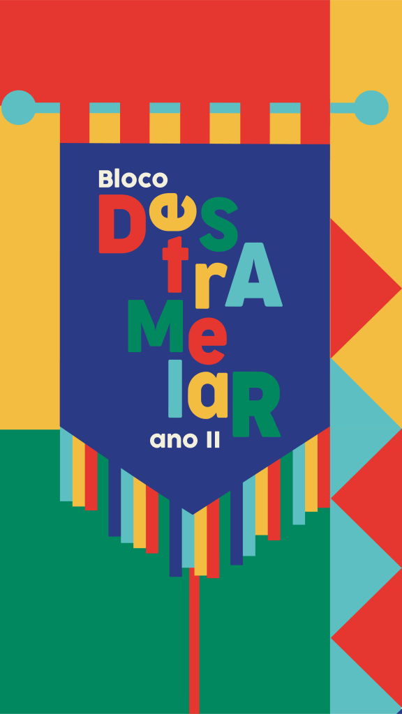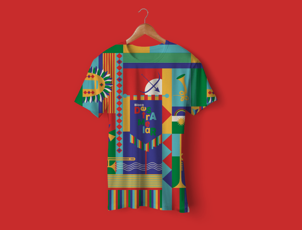 Folia na rua e frevo no pé! Tradicionalmente as camisas de bloco são feitas com duas cores, que viram as cores oficiais do bloco e colorem as ruas da cidade naquele dia. Mas não tinha como o Bloco Destramelar não ser mais colorido. Ele nasceu do frevo, do fervo, dos ritmos populares. Sua energia exala isso também pelas cores. Essa foi a camisa do bloco em 2020.