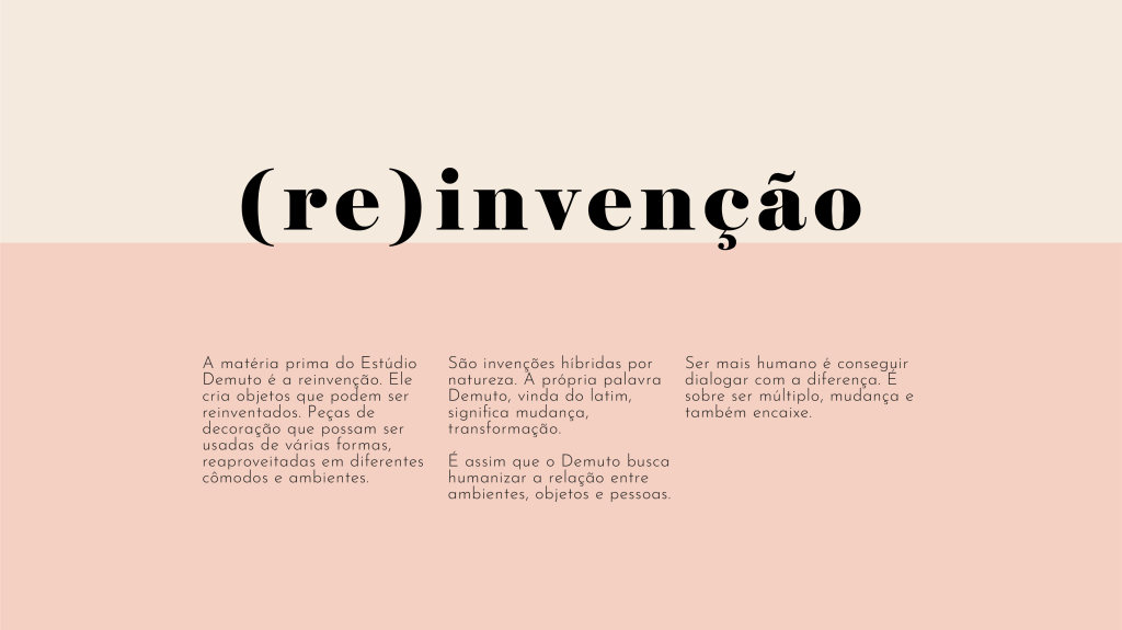 Redesign da identidade visual para estúdio de design de objetos de decoração e interiores. O Demuto ganhou maturidade e entrou em uma nova fase, foi pra esse novo momento que a sua identidade foi pensada. Mais madura, mas ainda divertida e moderna.