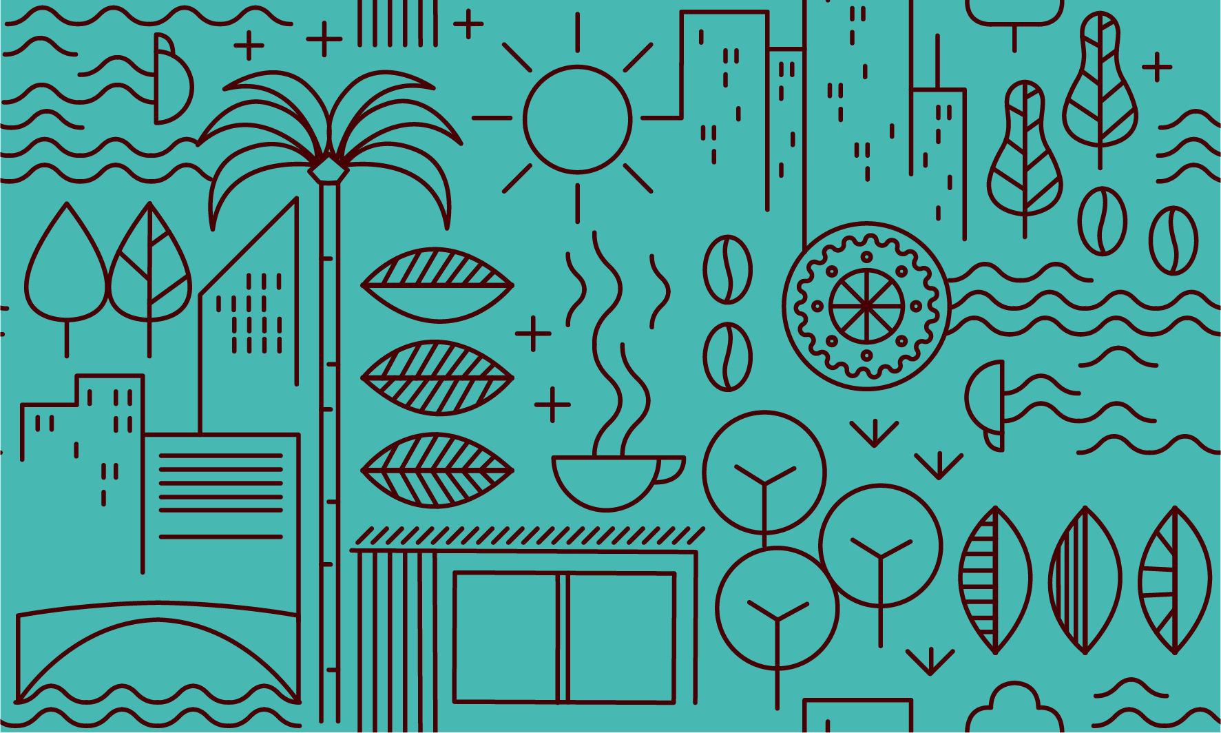 Na estampa institucional que fiz para a marca, quis retratar esses dois universos: o clima cosmopolita dos executivos da região e a natureza que propõe a pausa. Ela foi aplicada em copos de café, cardápio, guardanapo, papel bandeja e na decoração do espaço.