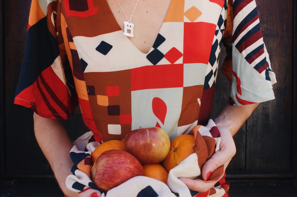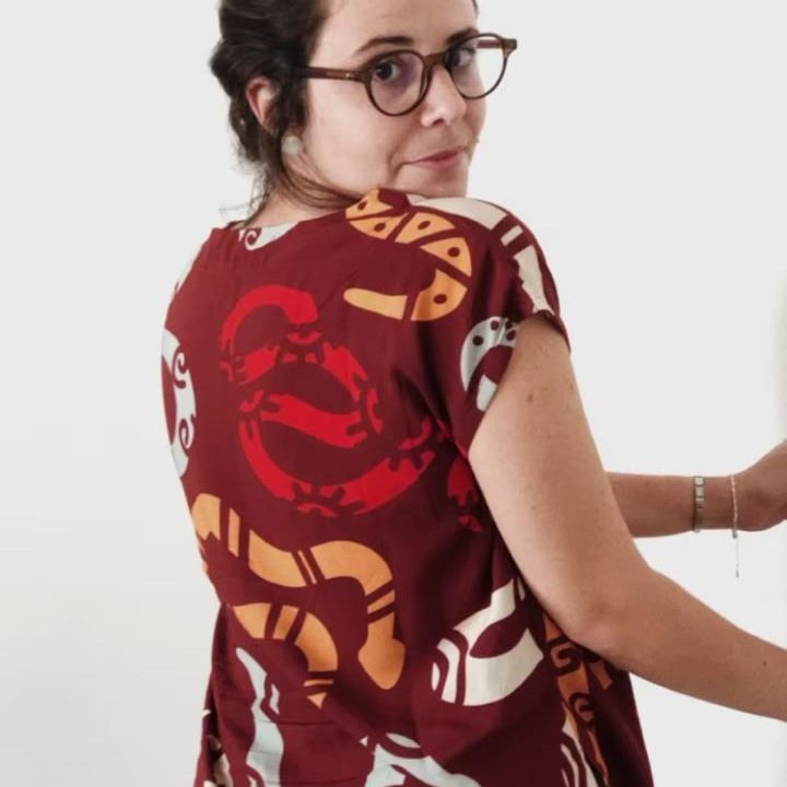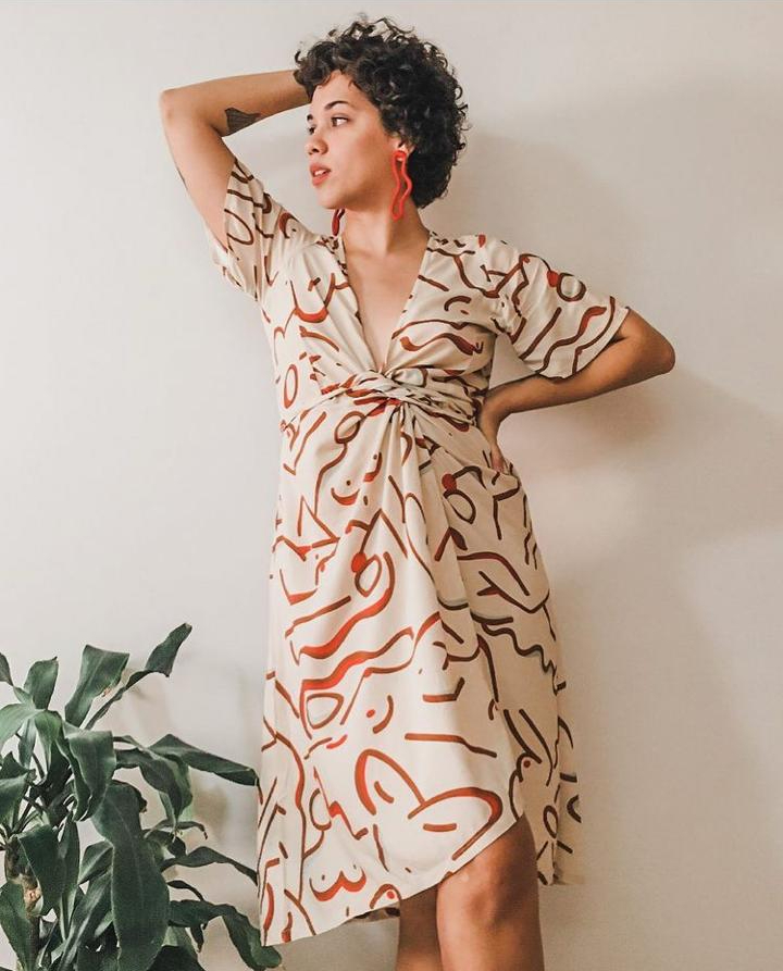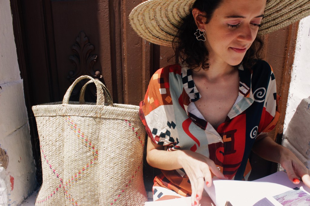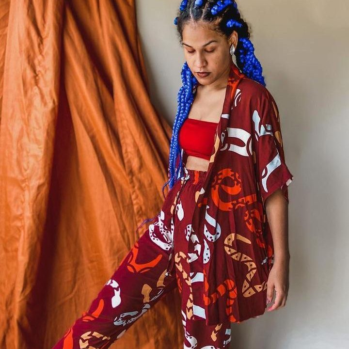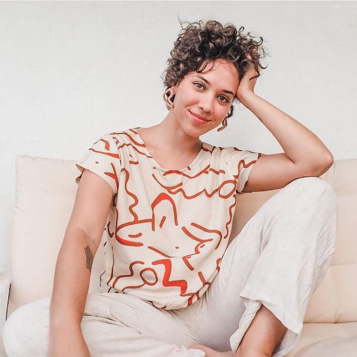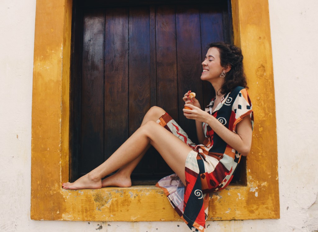 A estampa “Pulei a Janela” propõe essa atmosfera de ousadia e coragem inspirada por Tereza. Nela, vários elementos se misturam formando blocos coloridos cheios de personalidade.